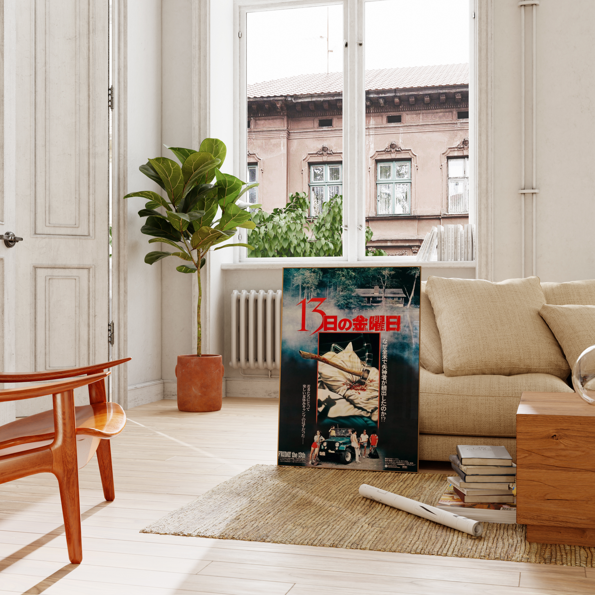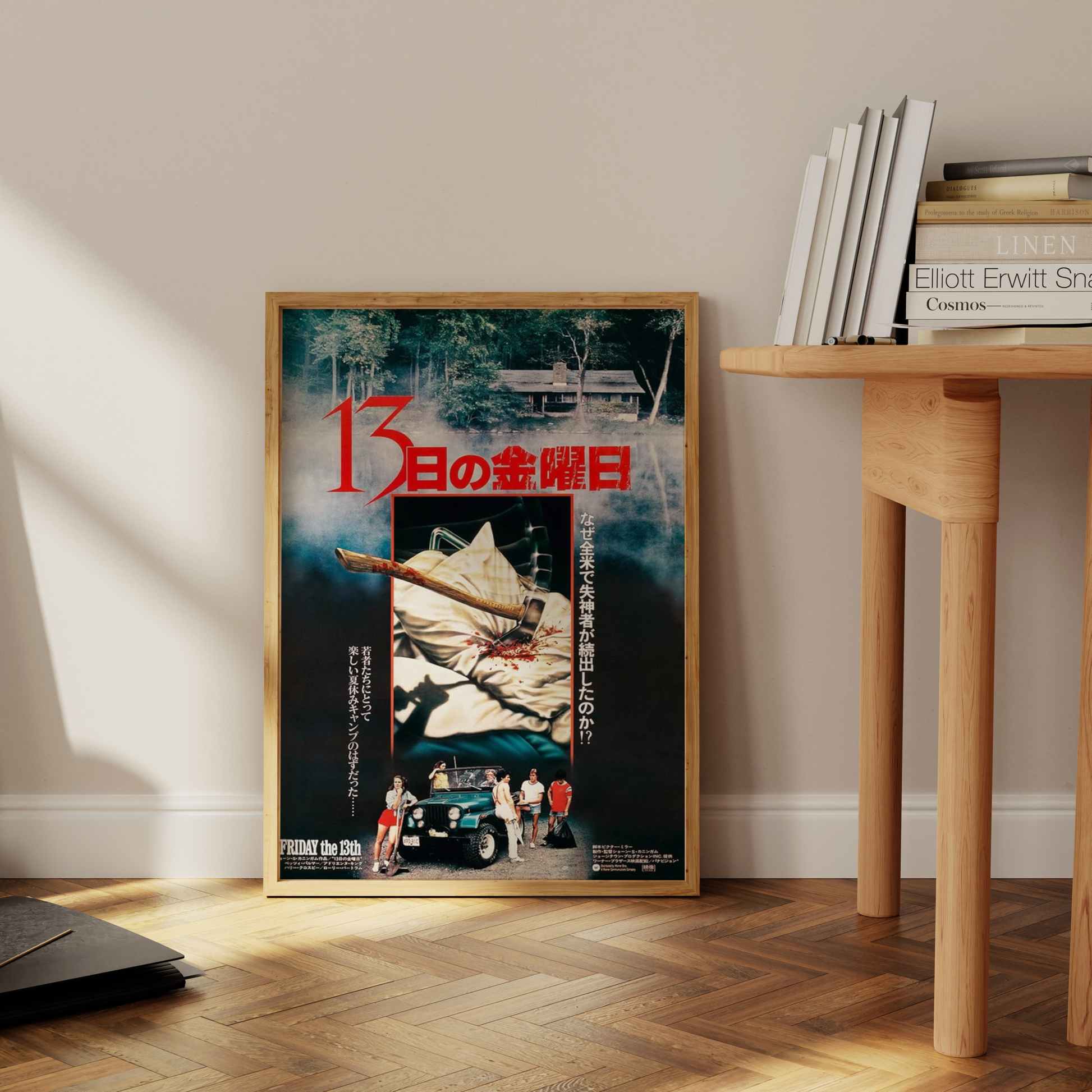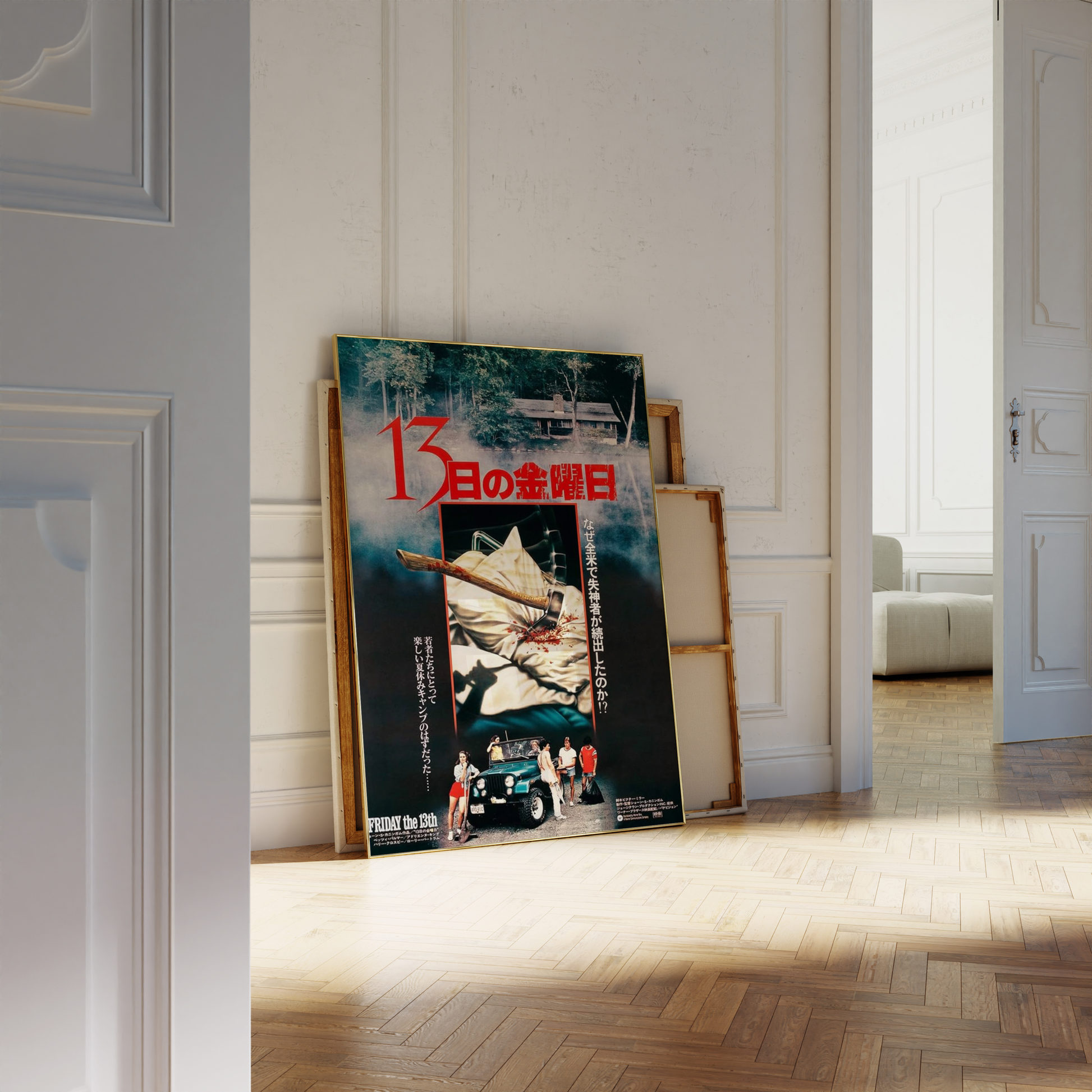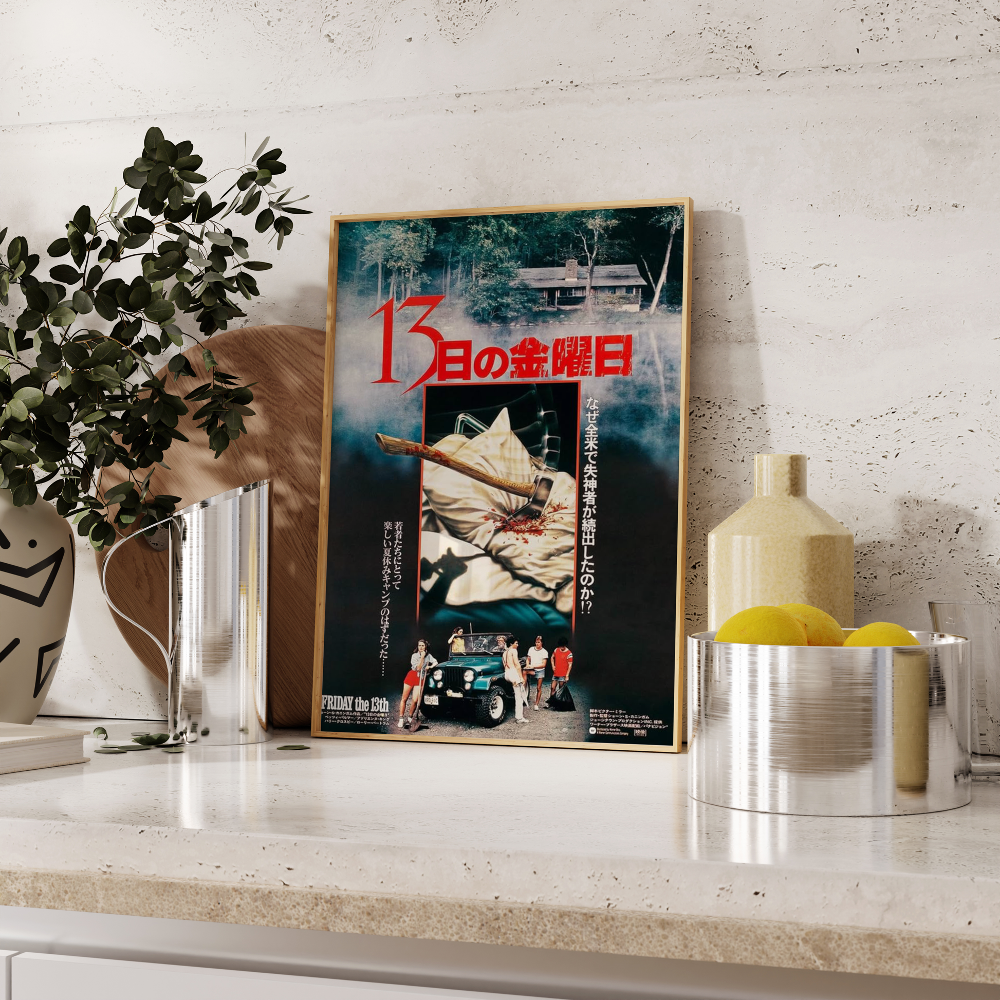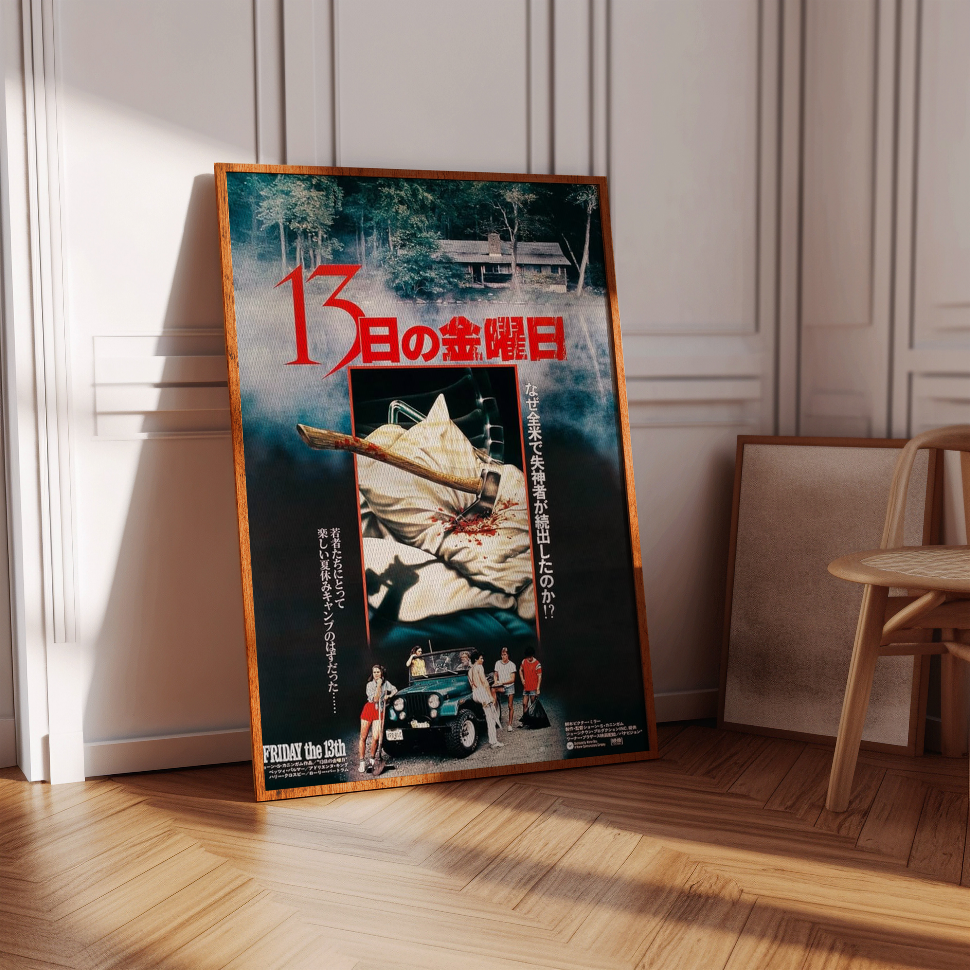 A Japanese horror poster for Friday the 13th (1980), blending violent imagery, eerie wilderness, and arriving campers. With bold red kanji and a grisly axe scene, it captures the suspense and blood-soaked chaos that awaits at Camp Crystal Lake.