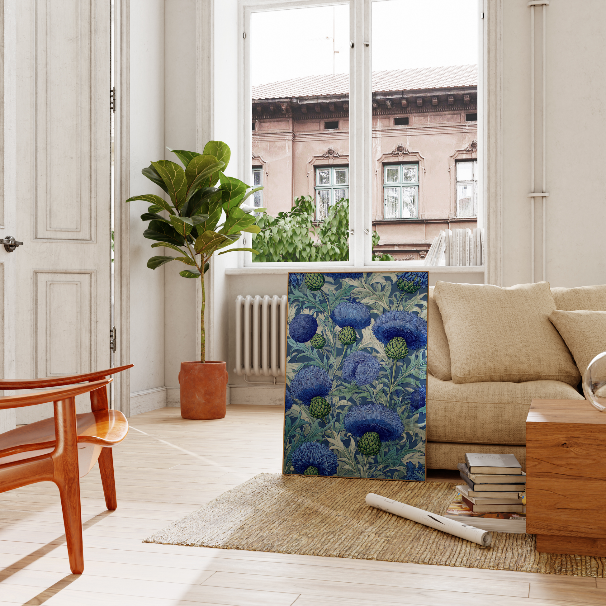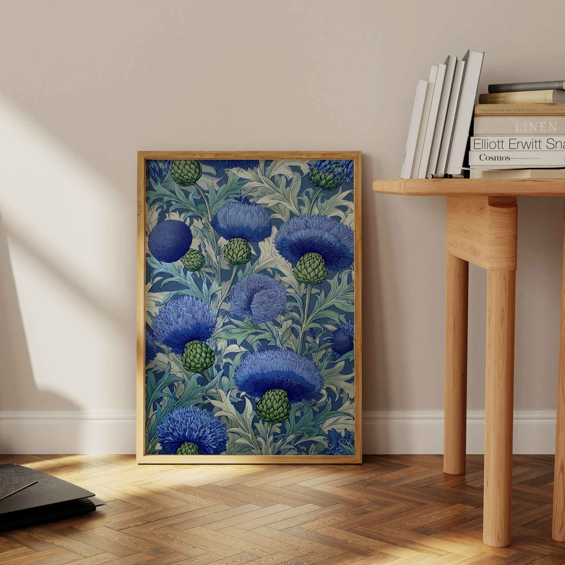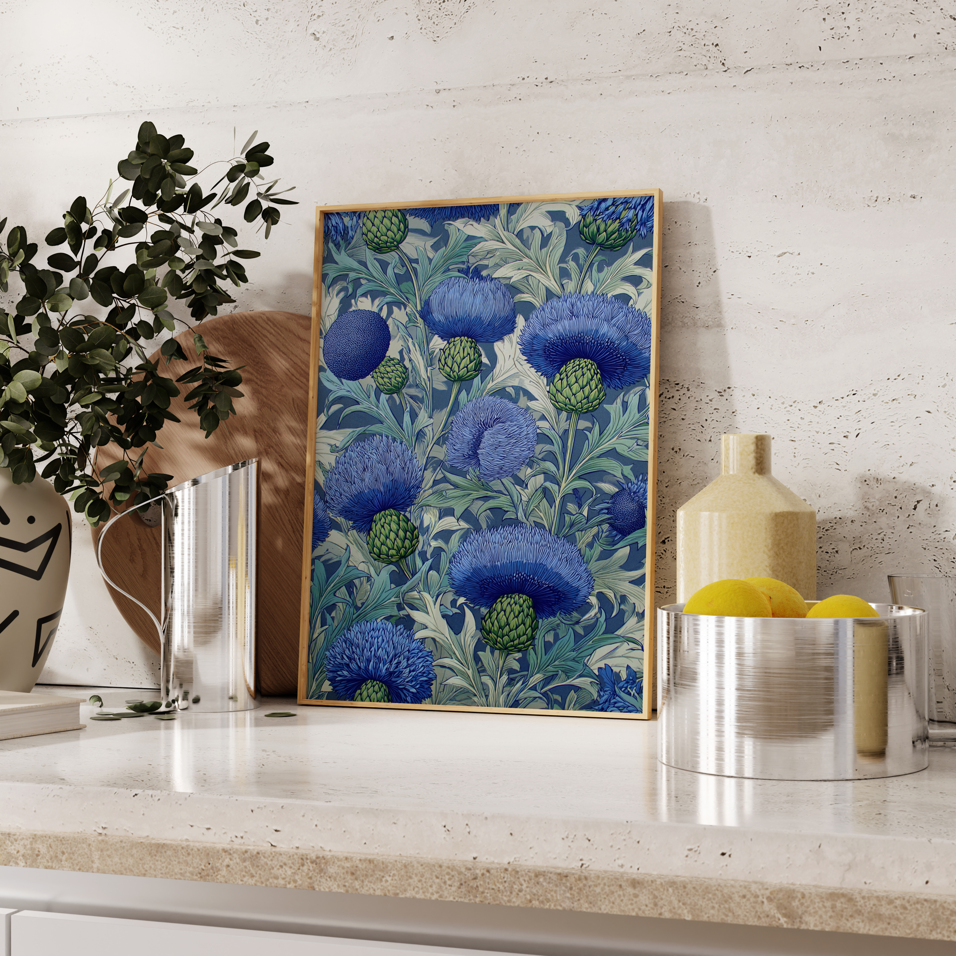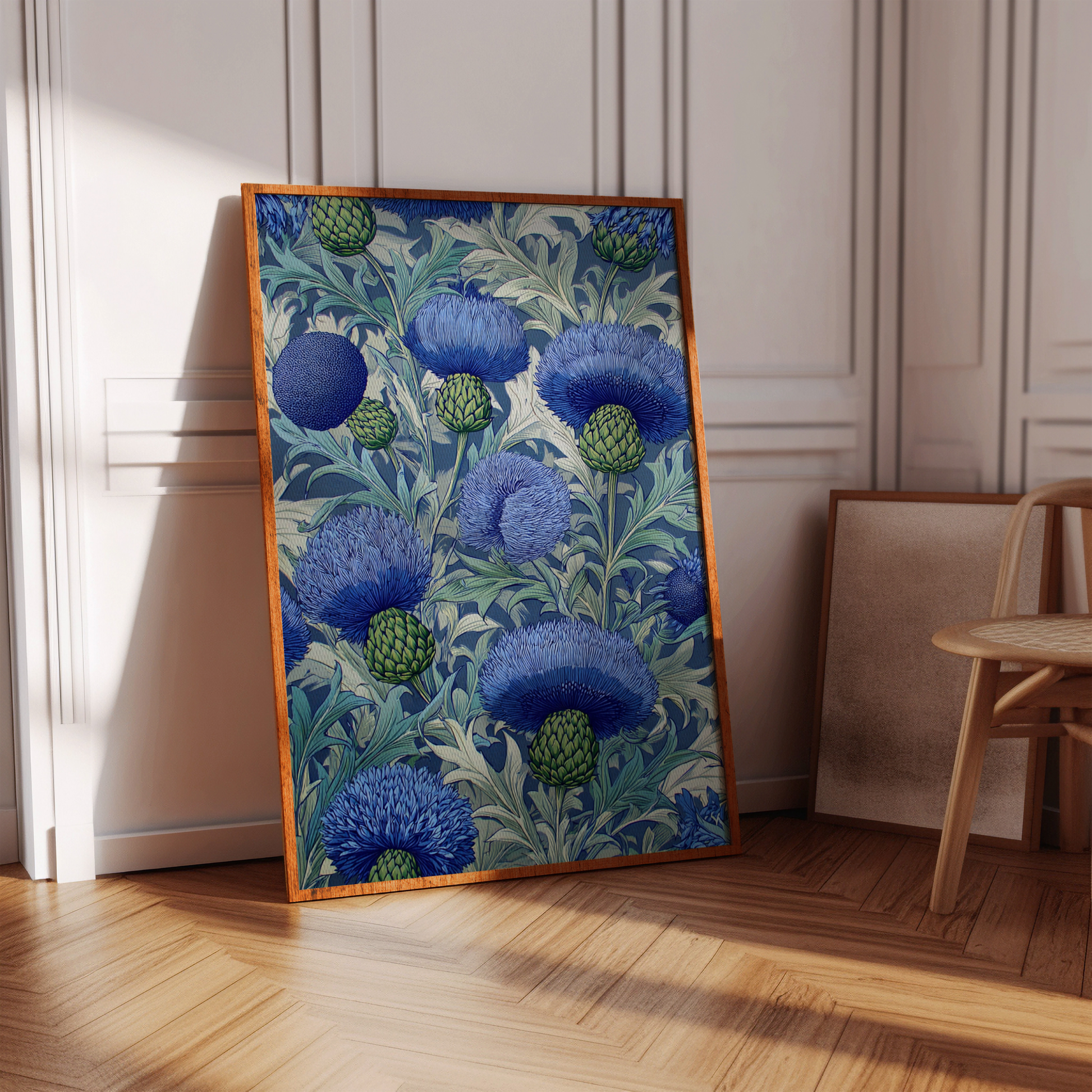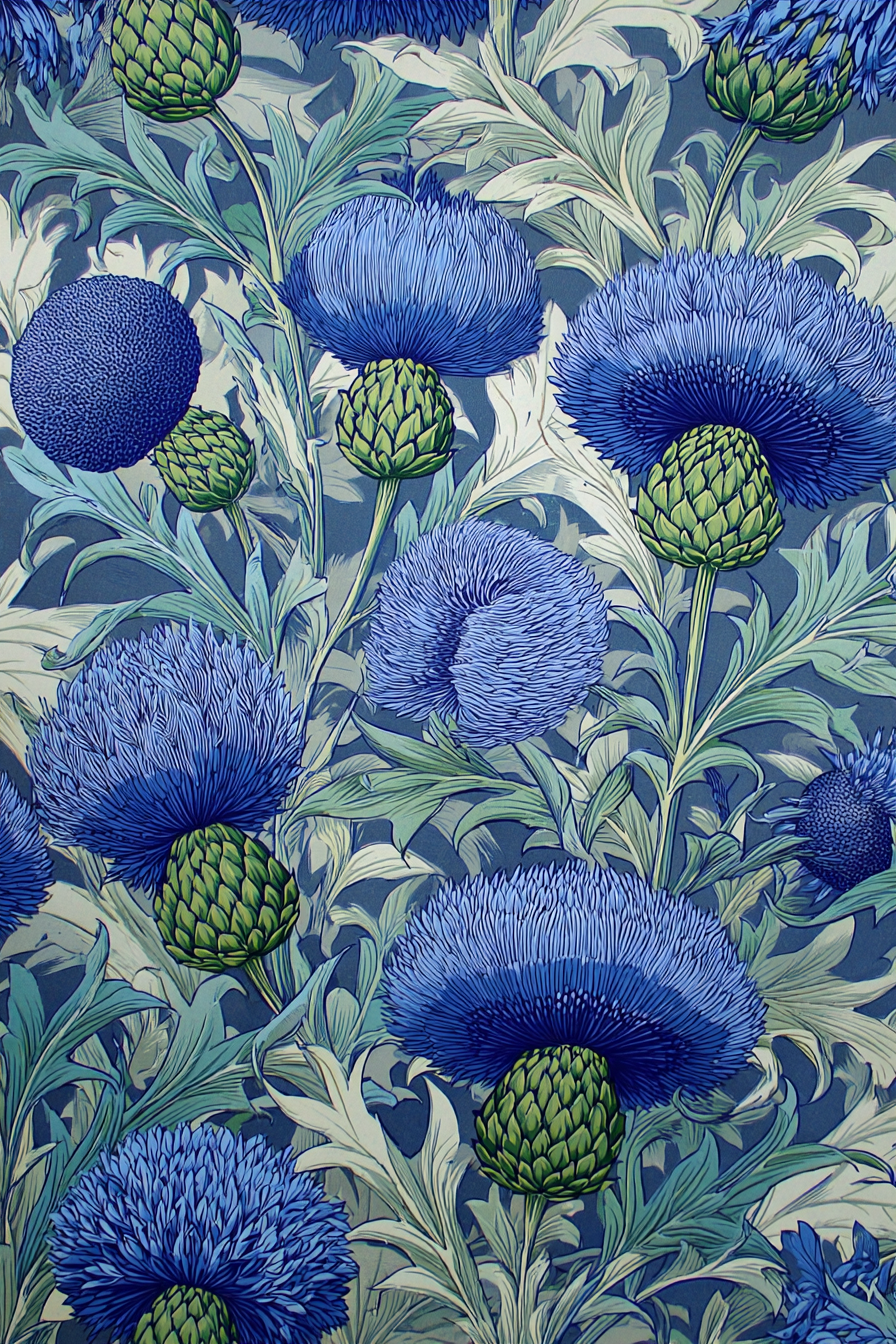 A striking botanical pattern of blooming blue thistles and lush green buds in a stylized woodcut style. Rich in detail and texture, this artwork captures nature’s structure and elegance with a timeless decorative charm.