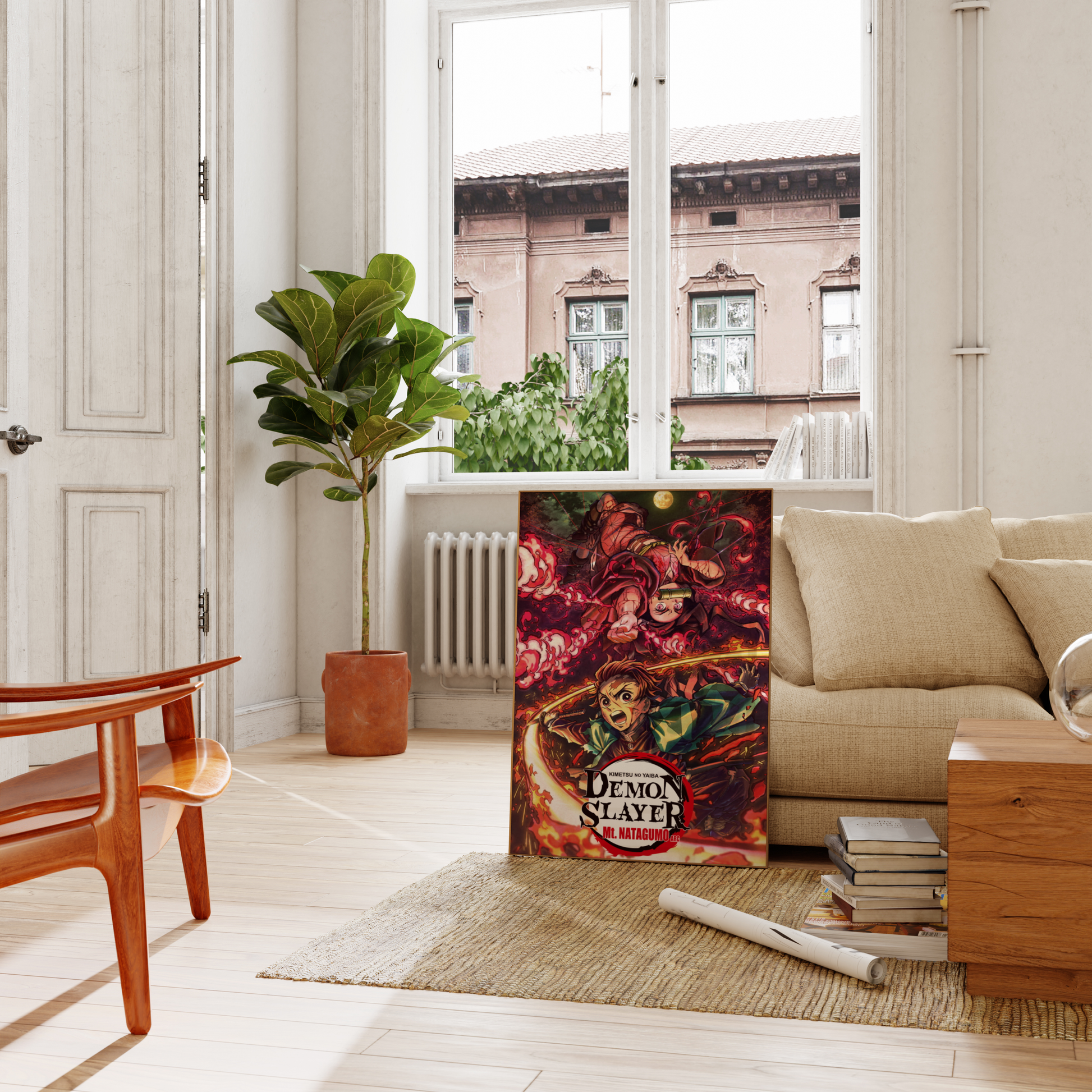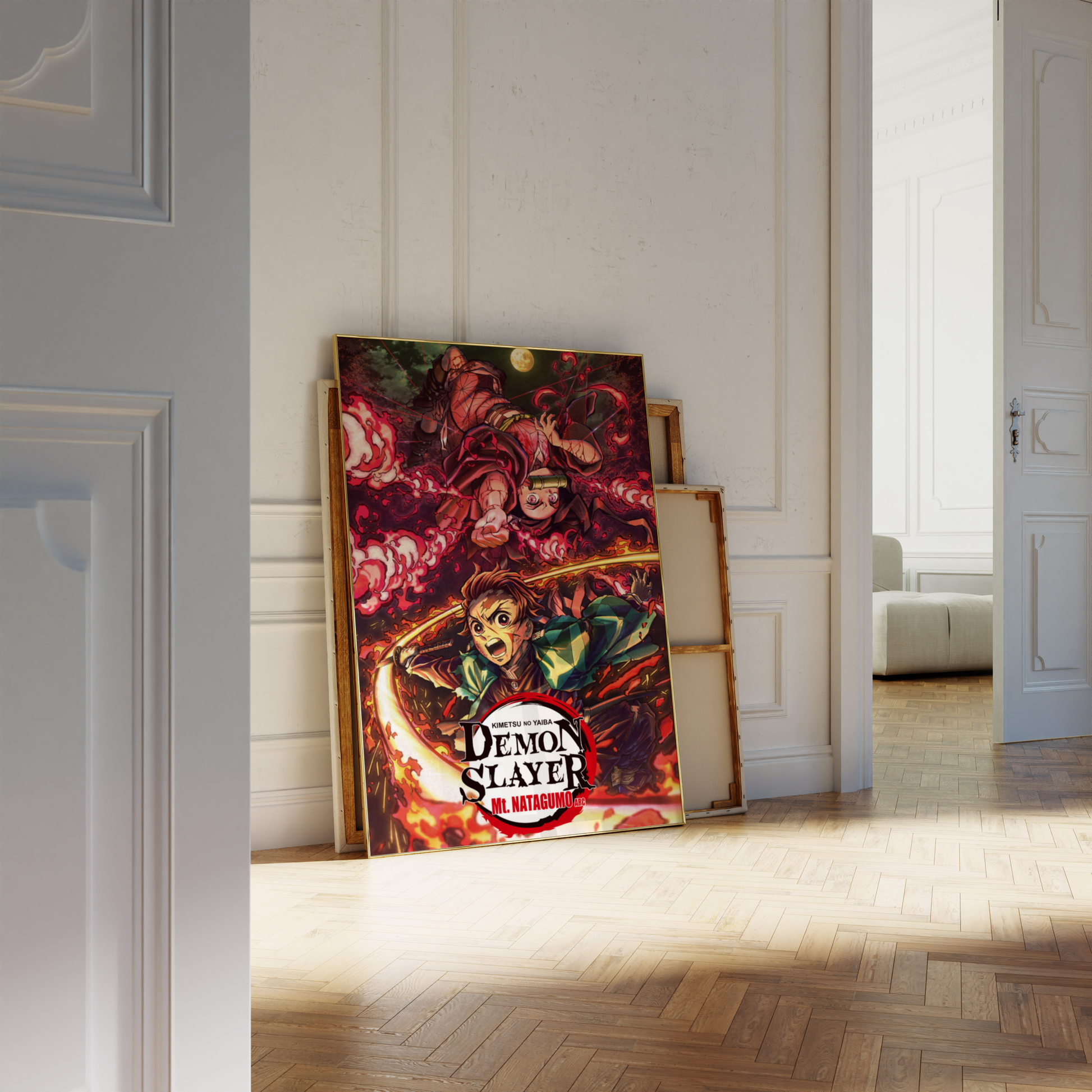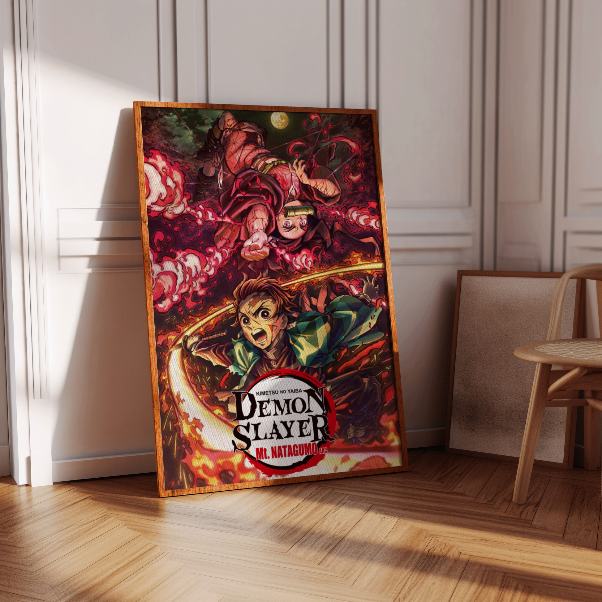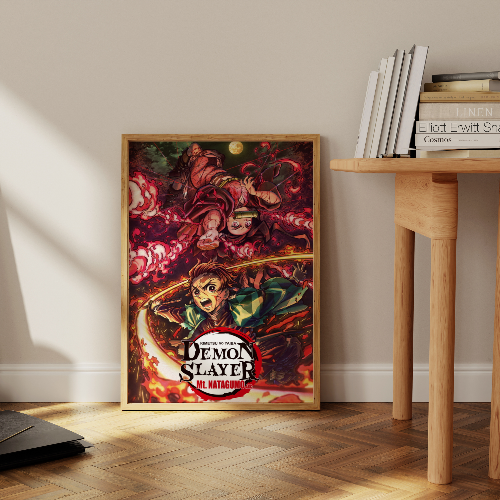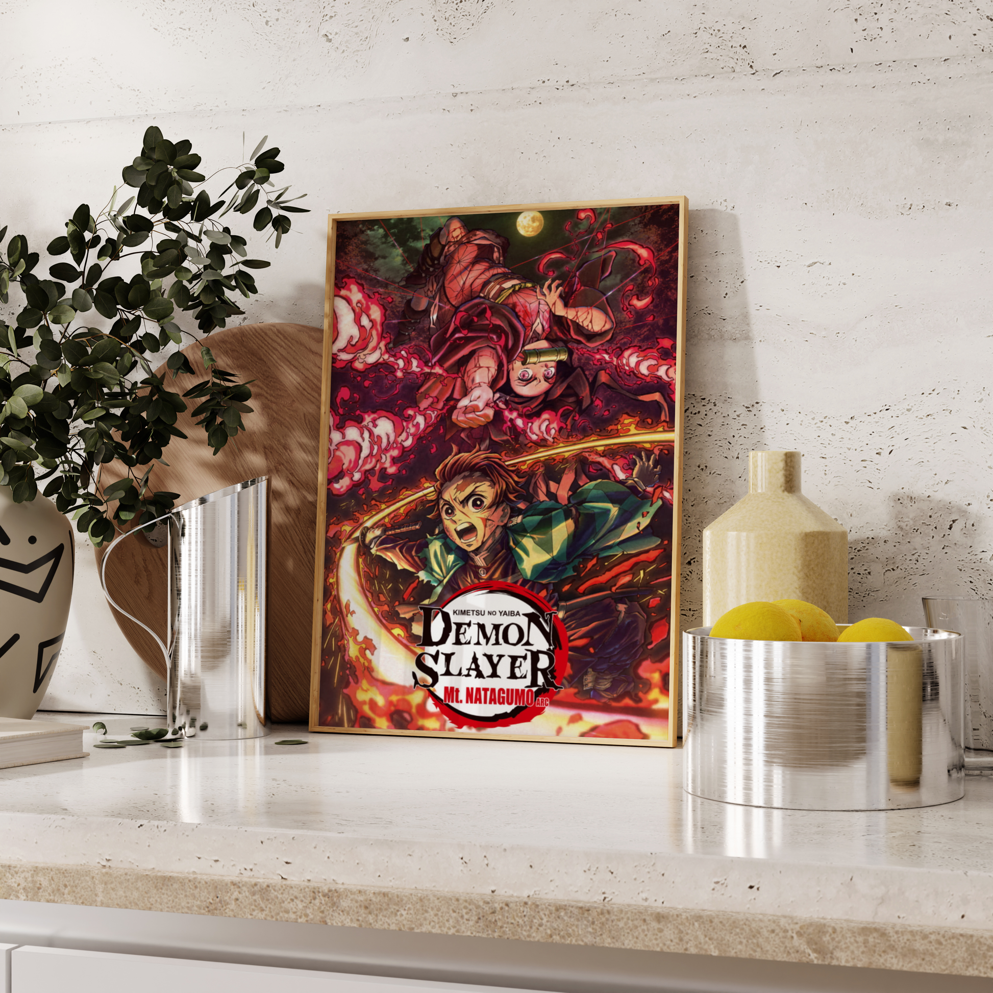 This is a vibrant promotional poster for the Mt. Natagumo Arc from the anime Demon Slayer: Kimetsu no Yaiba. It features Tanjiro Kamado wielding his flaming Nichirin Blade and Nezuko caught in demon threads, with a blood moon casting an ominous glow over the forest backdrop.