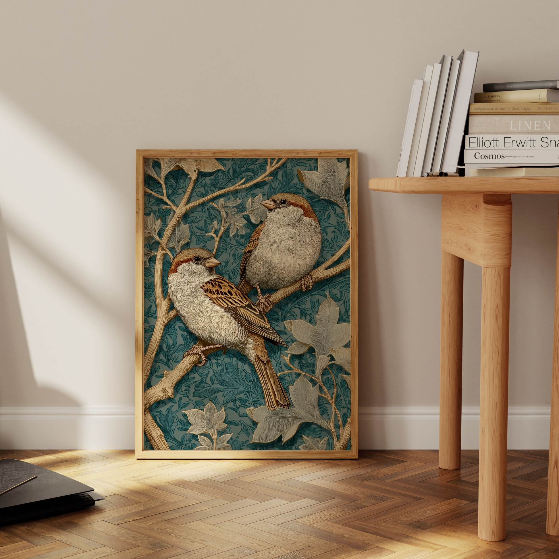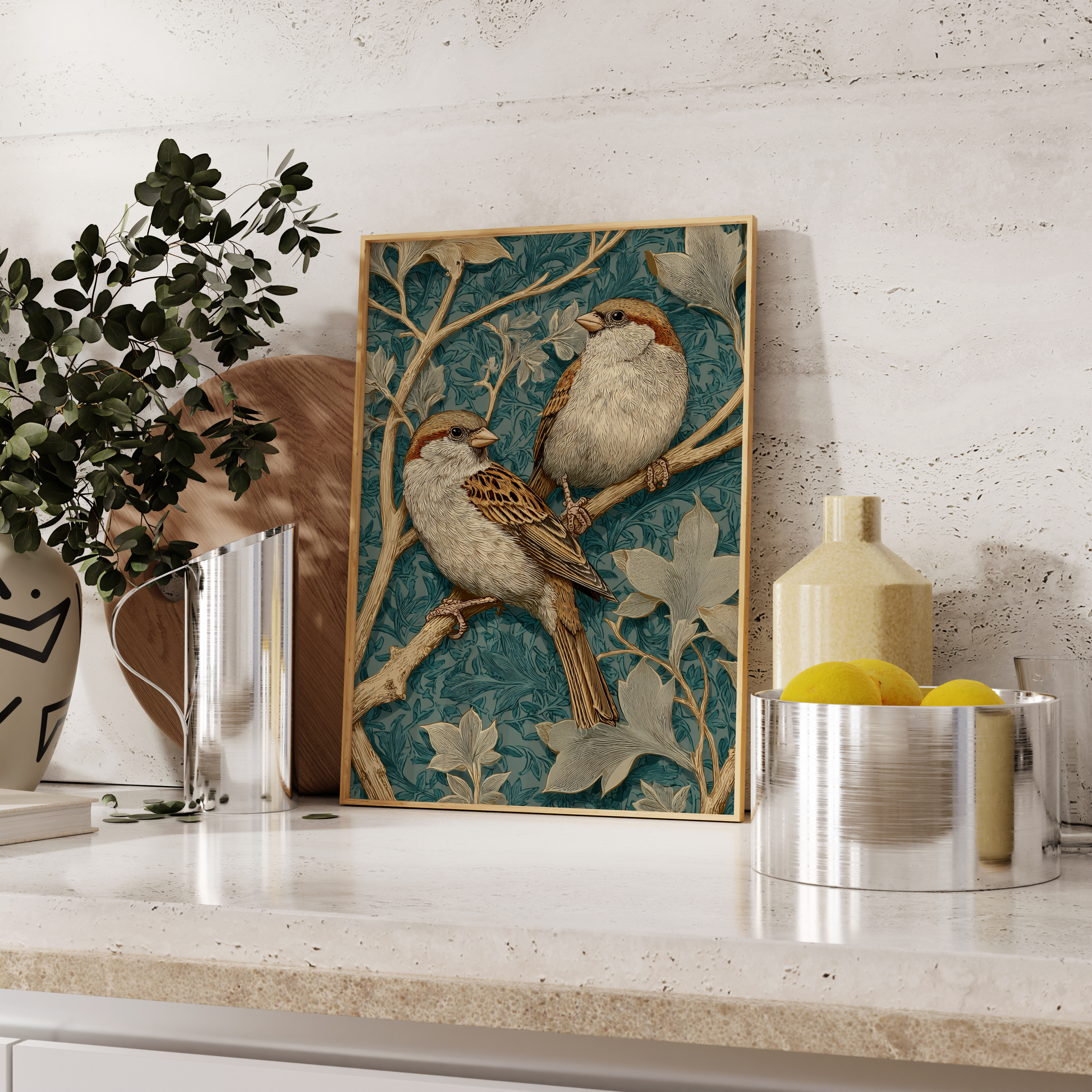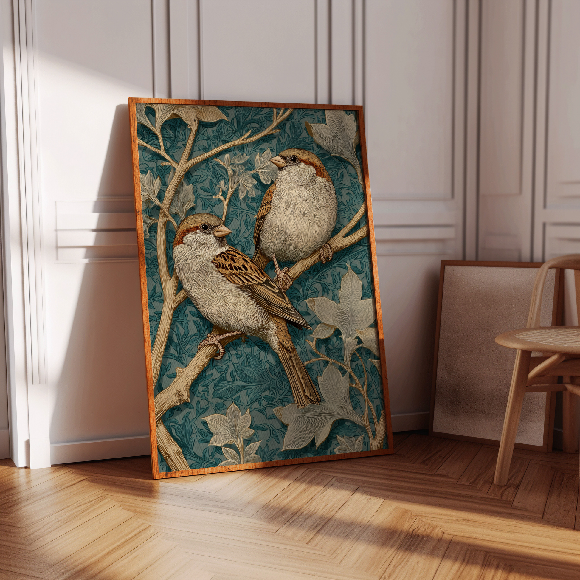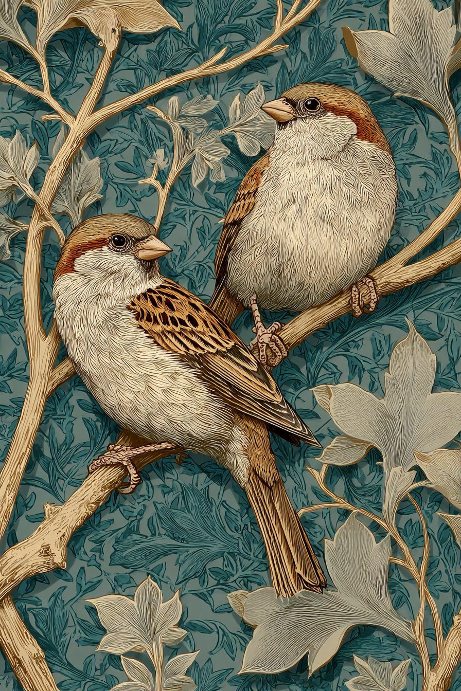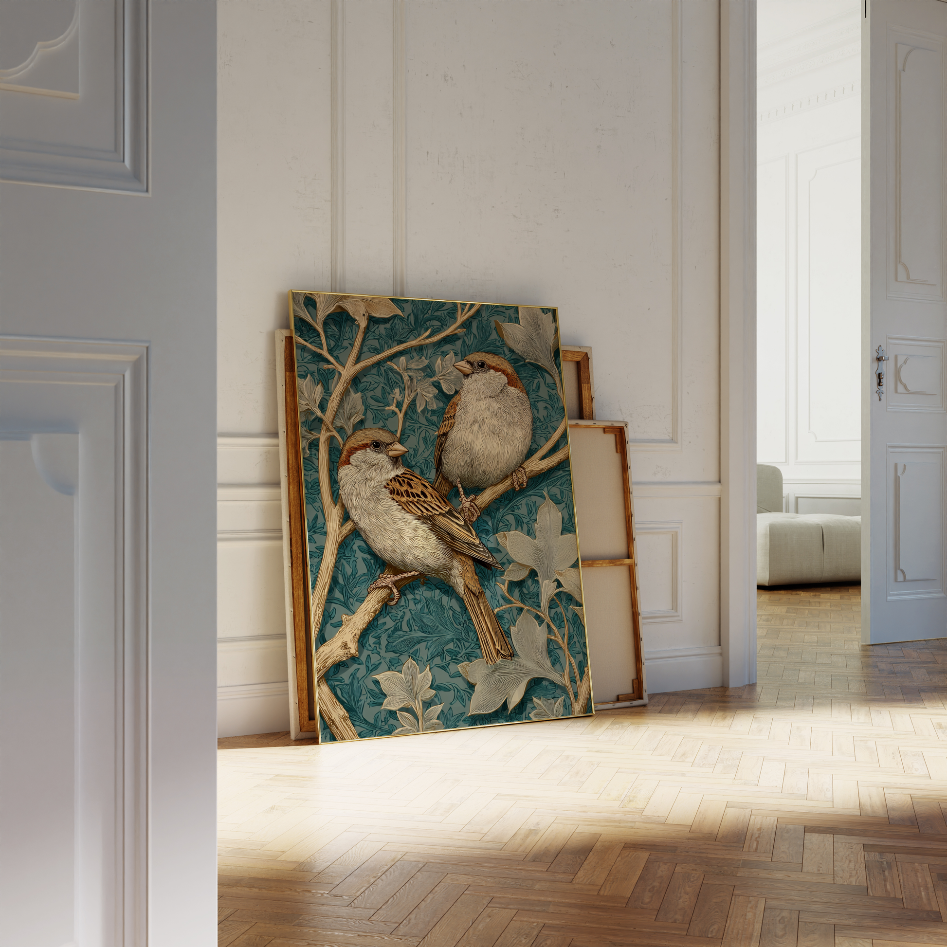 A vintage-style painting of two sparrows perched on golden branches, set against intricate William Morris–inspired foliage. Elegant, peaceful, and richly detailed with nature’s quiet charm.