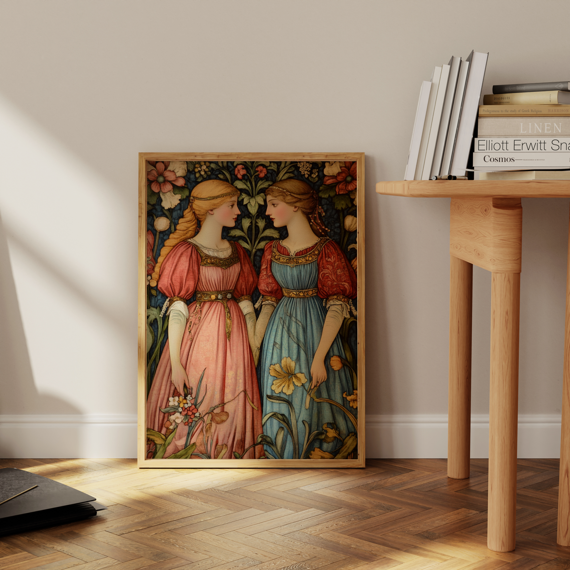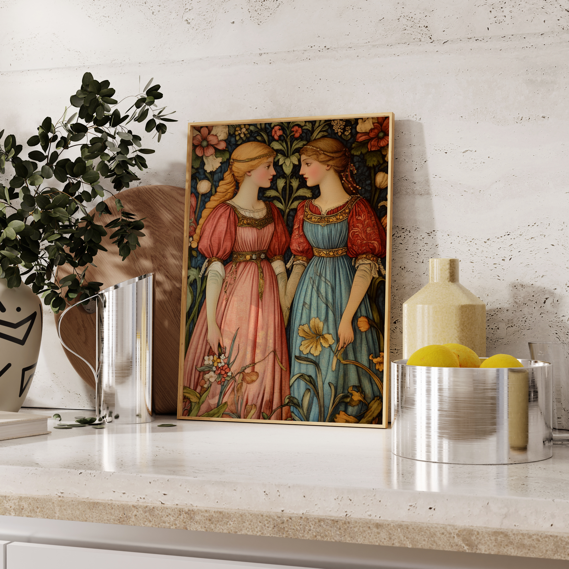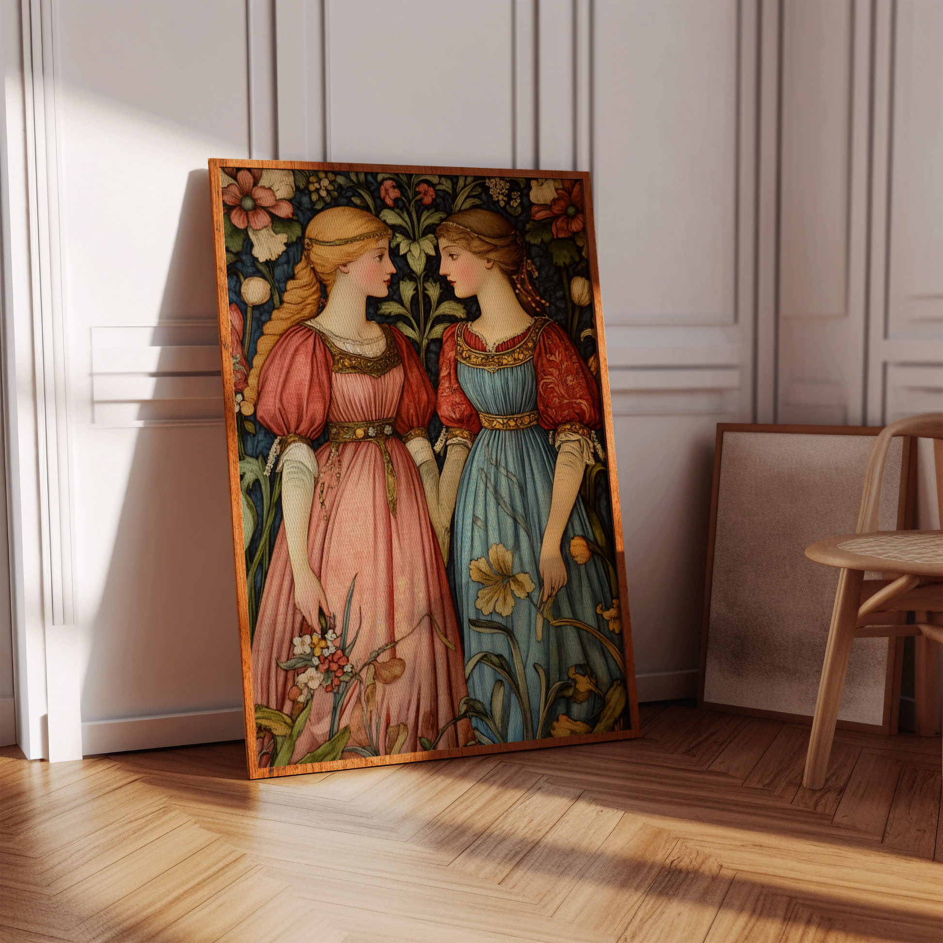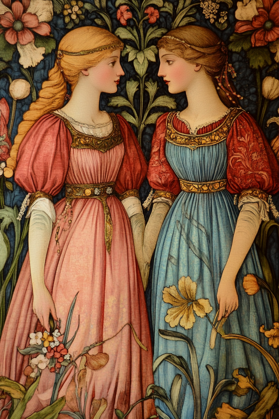 An ornate, William Morris–inspired painting of two women in richly detailed Renaissance gowns, surrounded by blooming flora. The piece captures a quiet moment of unity and grace, evoking timeless beauty and sisterhood.