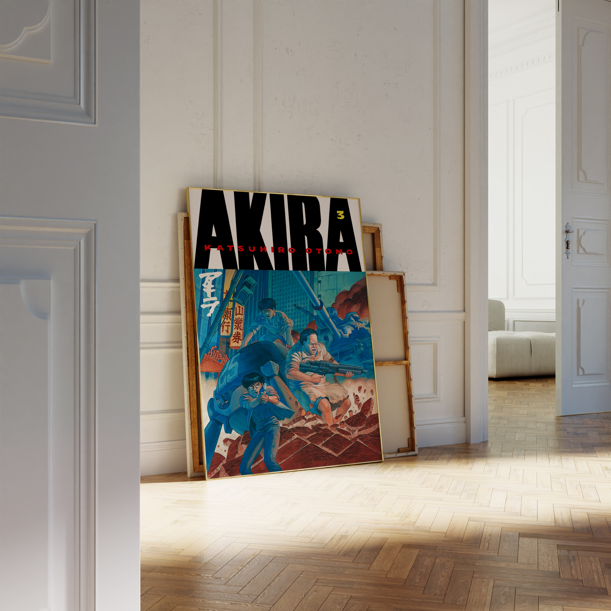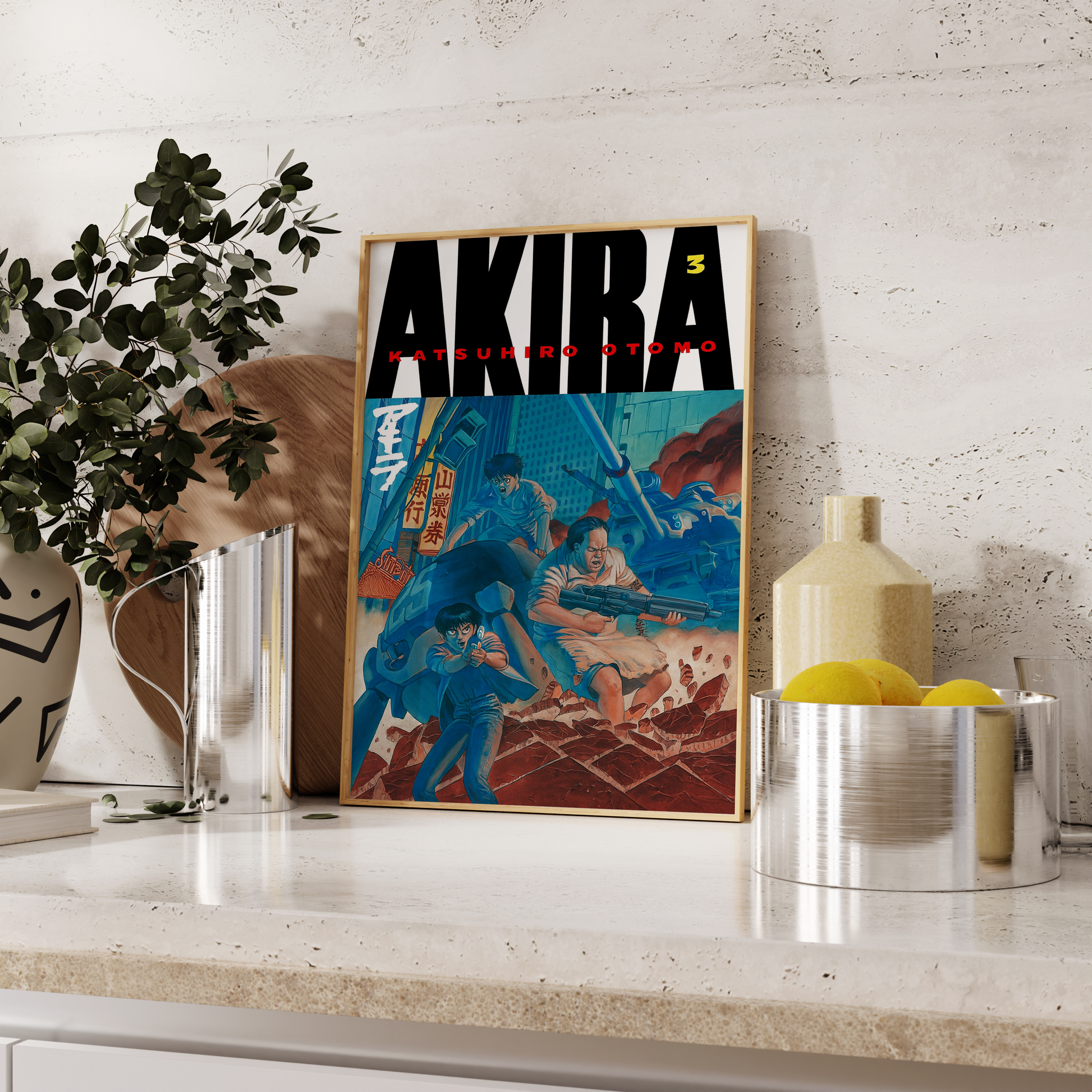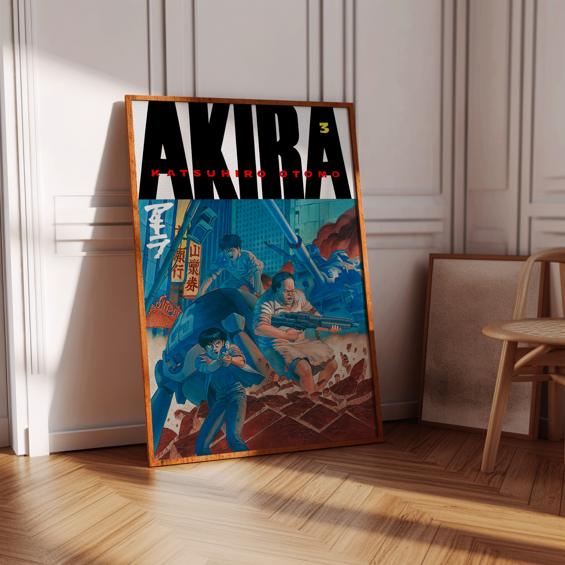 An explosive Akira poster from Volume 3, channeling the chaos of rebellion in Neo-Tokyo. Featuring bold action, militarized tension, and gritty brushstrokes, it captures the manga’s raw, revolutionary spirit.