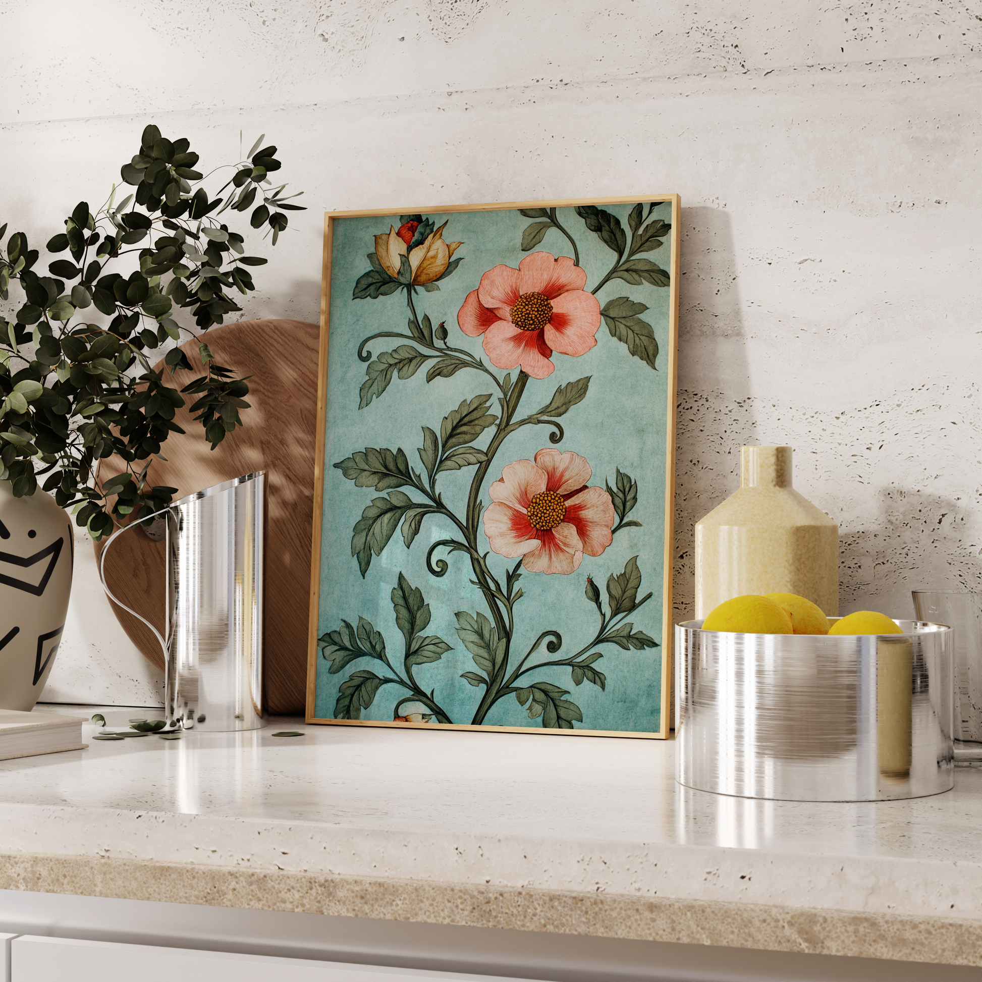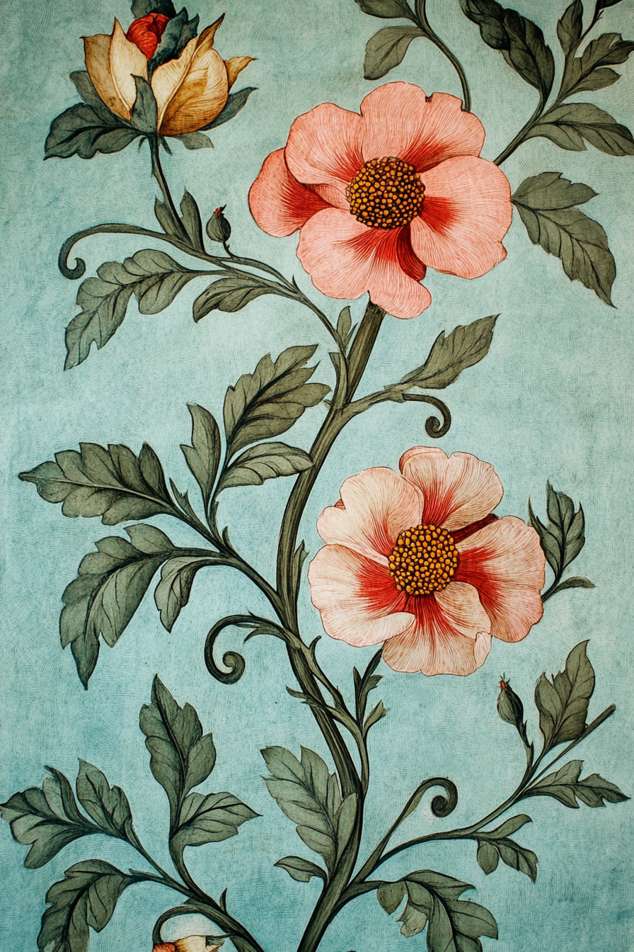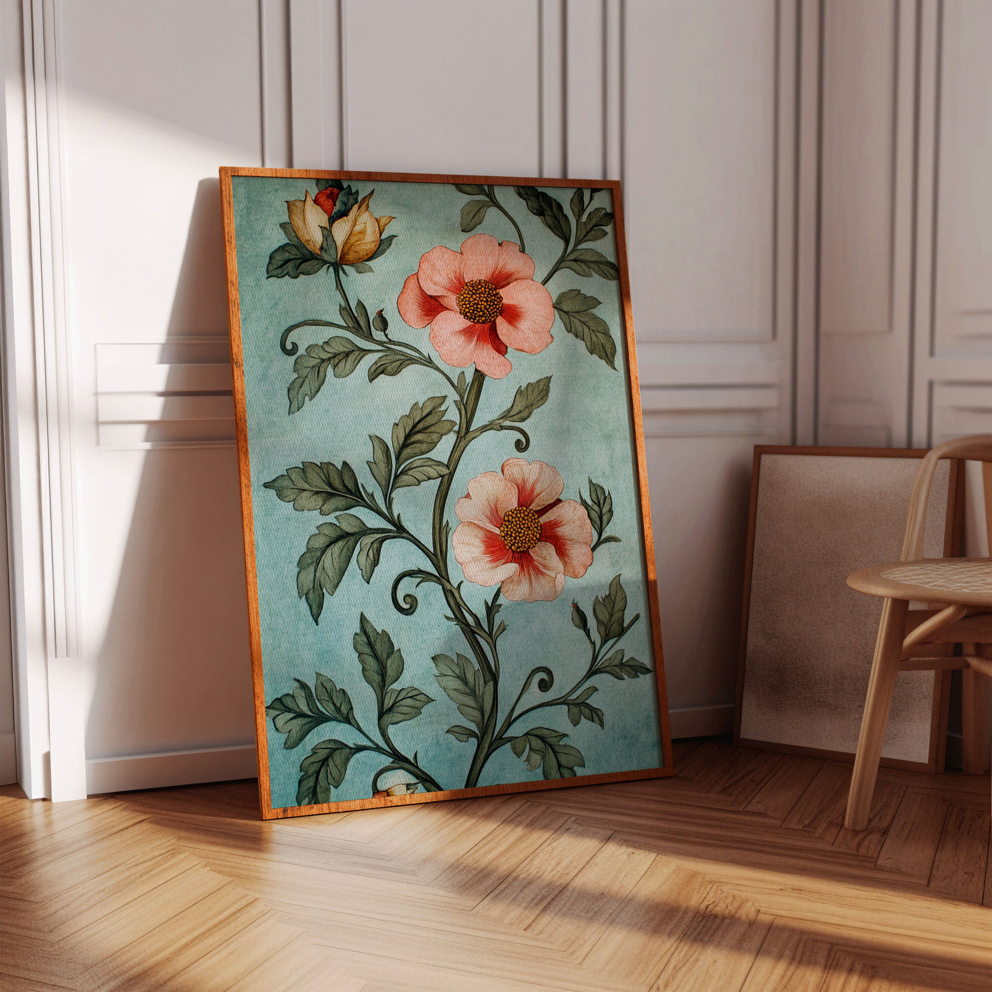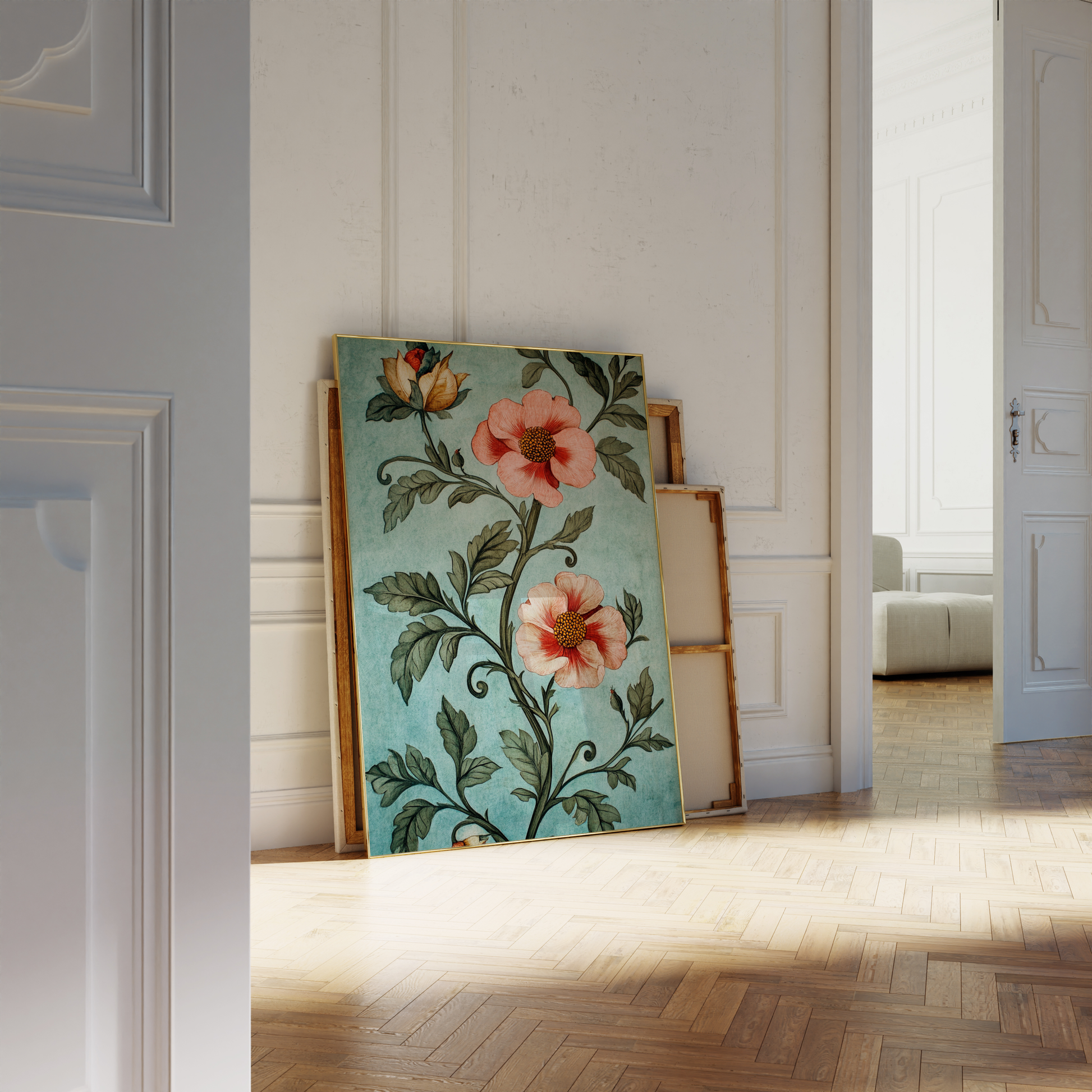 A delicate, William Morris–style floral painting featuring detailed pink blossoms and winding green stems on a soft blue background. Timeless, elegant, and richly decorative.