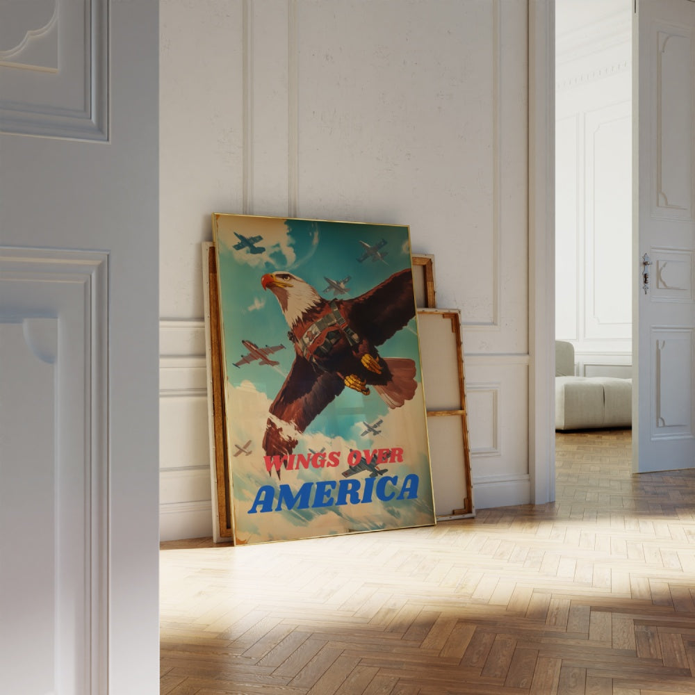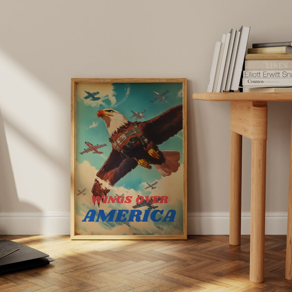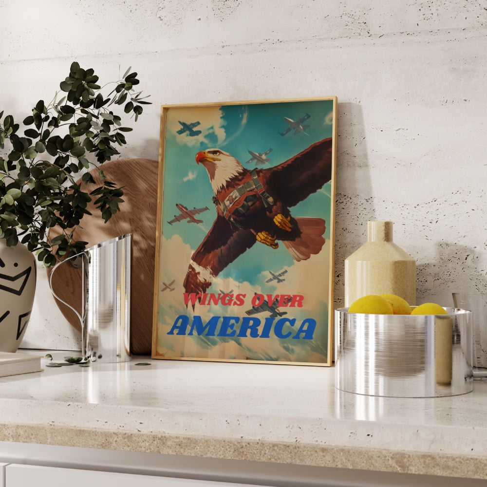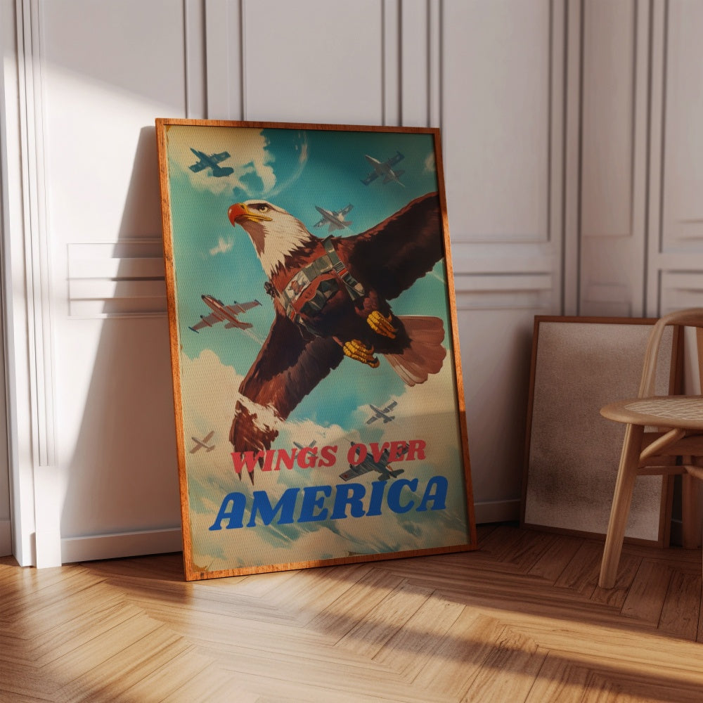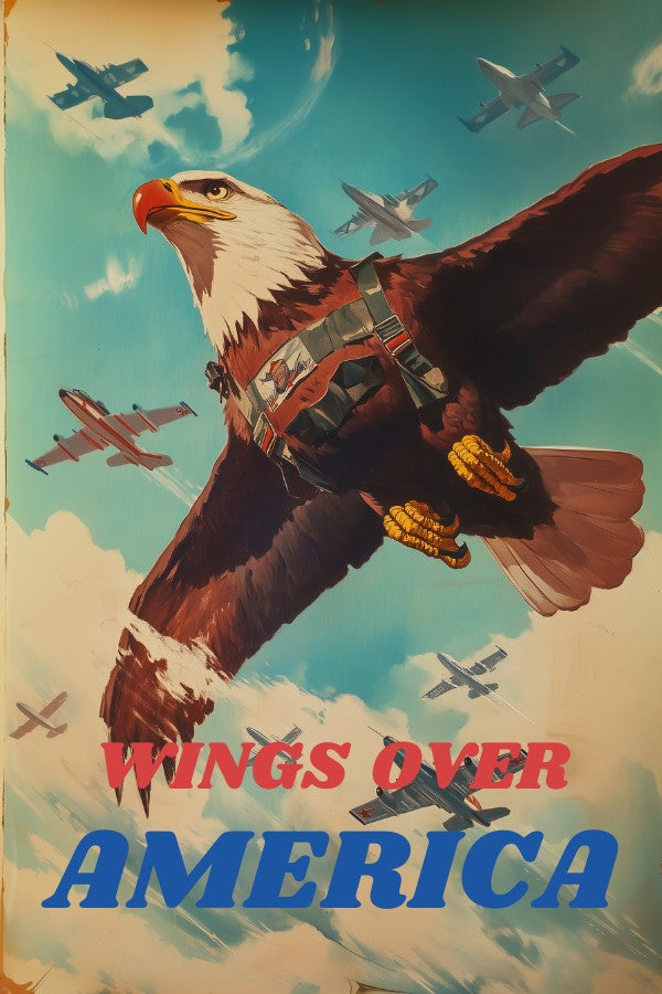 Take flight with Wings Over America, a striking poster that captures the patriotic power of a soaring eagle leading a squadron of WWII fighter jets! Decked out in its aviator gear, this majestic bird takes command of the skies, blending freedom, history, and a bold dash of American spirit.
